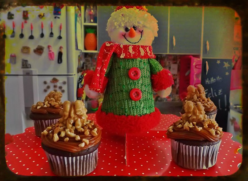Assei cupcakes de chocolate e decorei com doce de leite, confeitos coloridos e nozes.